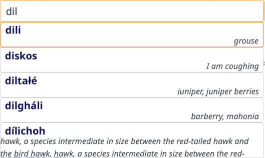 Click on words within an entry to search for those Apache or English words within the dictionary. Hit Enter or Click the result to proceed to the entry.